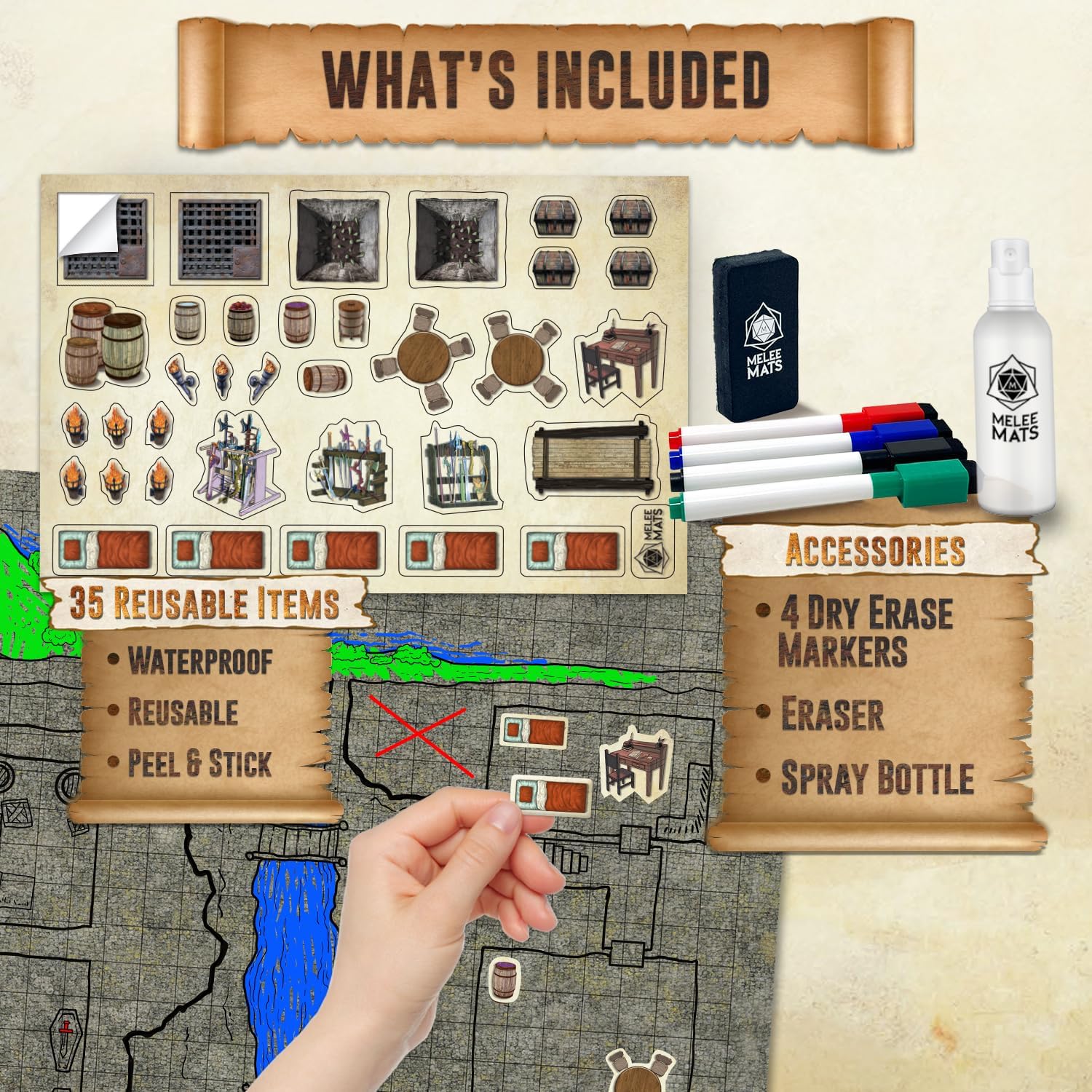 Melee Mats DND Map Starter Kit for Dungeons & Dragons Game - 24” x 36" 3 Pack Double Sided, Wet/Dry Erase Battle Terrain Grid - Ultimate Tabletop Board Gaming Experience with Accessories