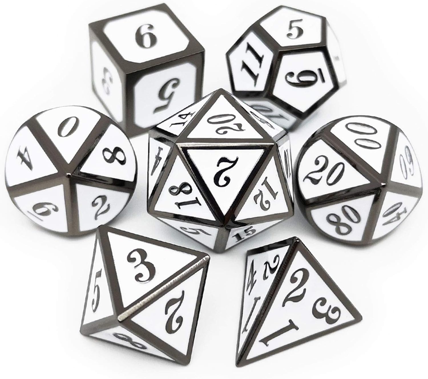 - Black White Metal DND Dice Set: 1xD20, 1xD12, 2xD10(one 00-90, one 0-9), 1xD8, 1xD6, 1xD4