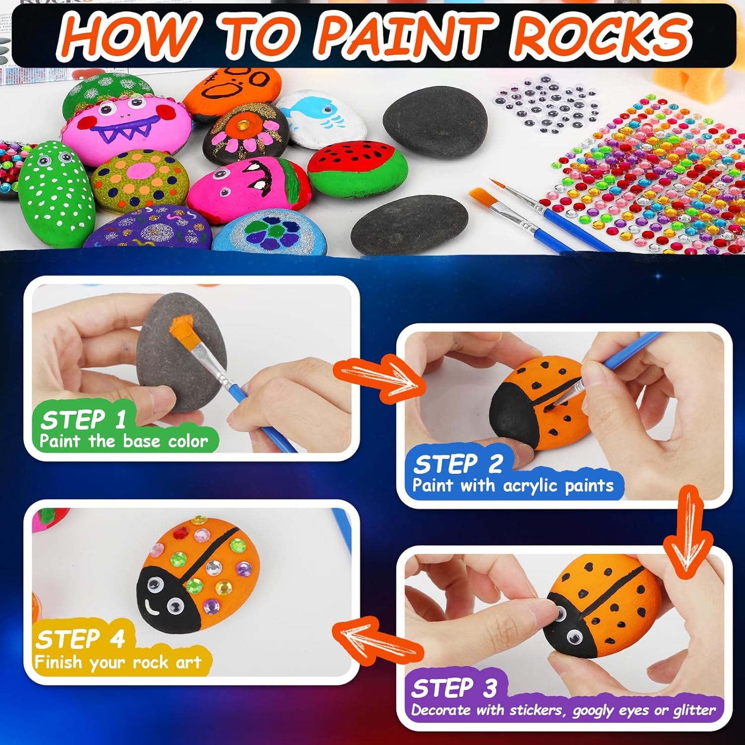 - 🌟【HIGH QUALITY & SAFE ROCK PIGMENTS】Boasting 12 vibrant, eco-friendly and non-toxic acrylic paints, indulge your color dream. Plus, 2 sheets of dazzling diamond stickers & 2 types of glitter glue elevate your artwork with a sparkly touch. Whether adorning rocks or outlining as a border, they transform your creations into eye-catching, one-of-a-kind masterpieces.