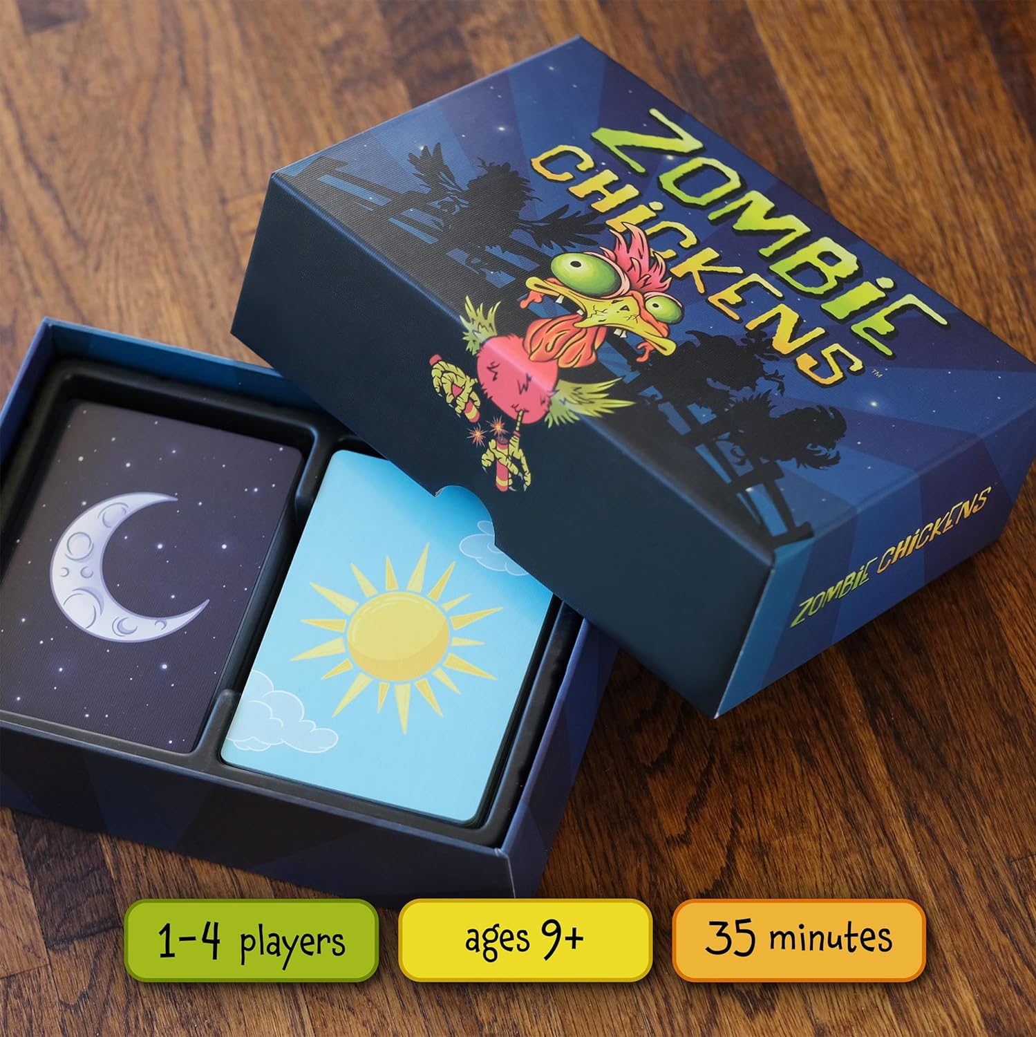 - GREAT FOR FAMILIES & FRIENDS OF ALL AGES - Zombie Chickens is the perfect card game for family game night, hanging out with friends, or playing solo in a round of zombie-fighting solitaire! 1-4 players, ages 9+, gameplay lasts around 35 minutes.