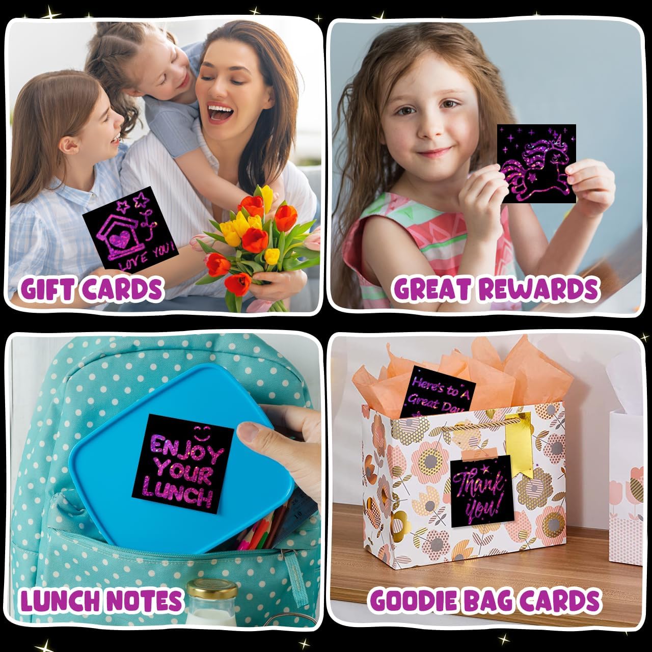 - Anywhere You Can Use: Our kids crafts for classroom could be scratch note pads and adult doodle pad to write thank you cards, jot down notes, etch doodles, create cool illustrations and designs, surprise people, label things, make lists and add fun notes in the kids lunch box and backpack. Give a chance to think outside the box and unleash kids creative spirit by the bulk art supplies gifts
