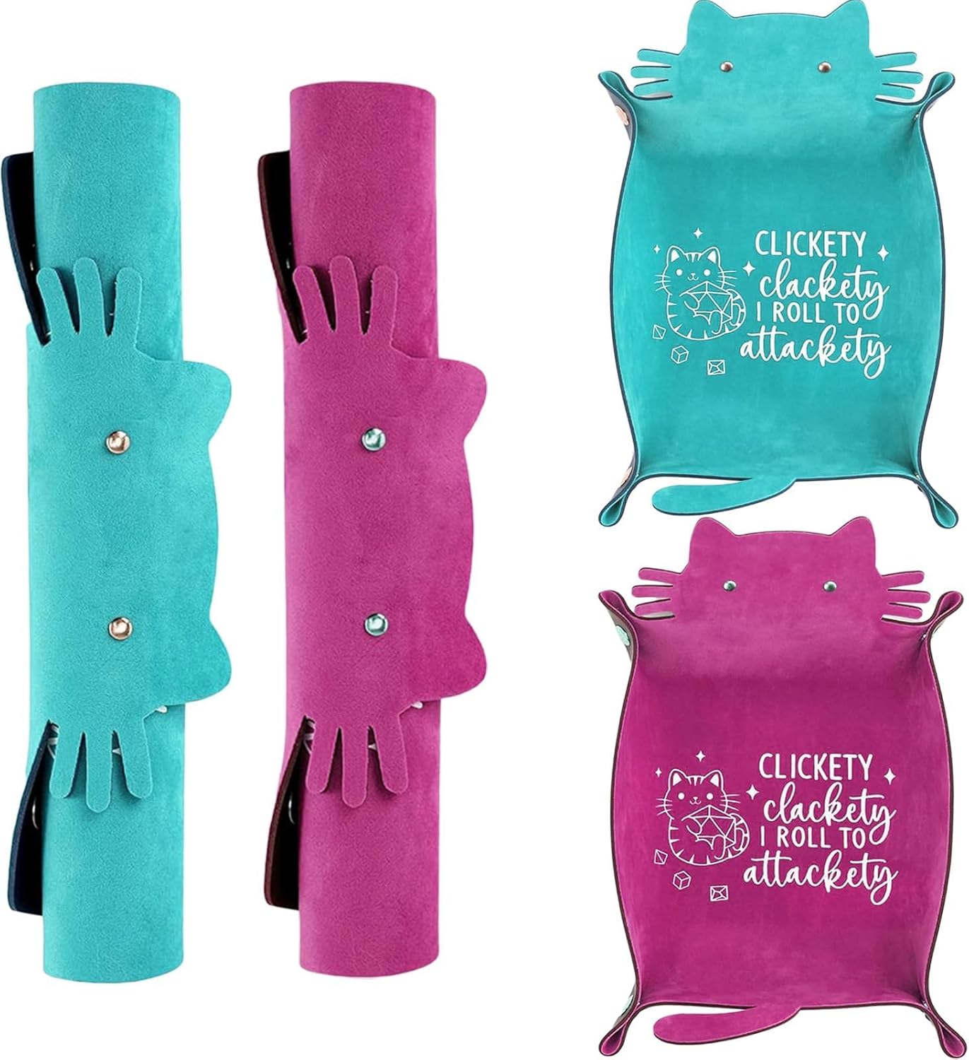 - DND Dice Tray: Package includes 2-pack cat-shaped leather trays which are printed with cute cat and funny words featuring purple and blue colors. Nice gift idea for the role-playing games players