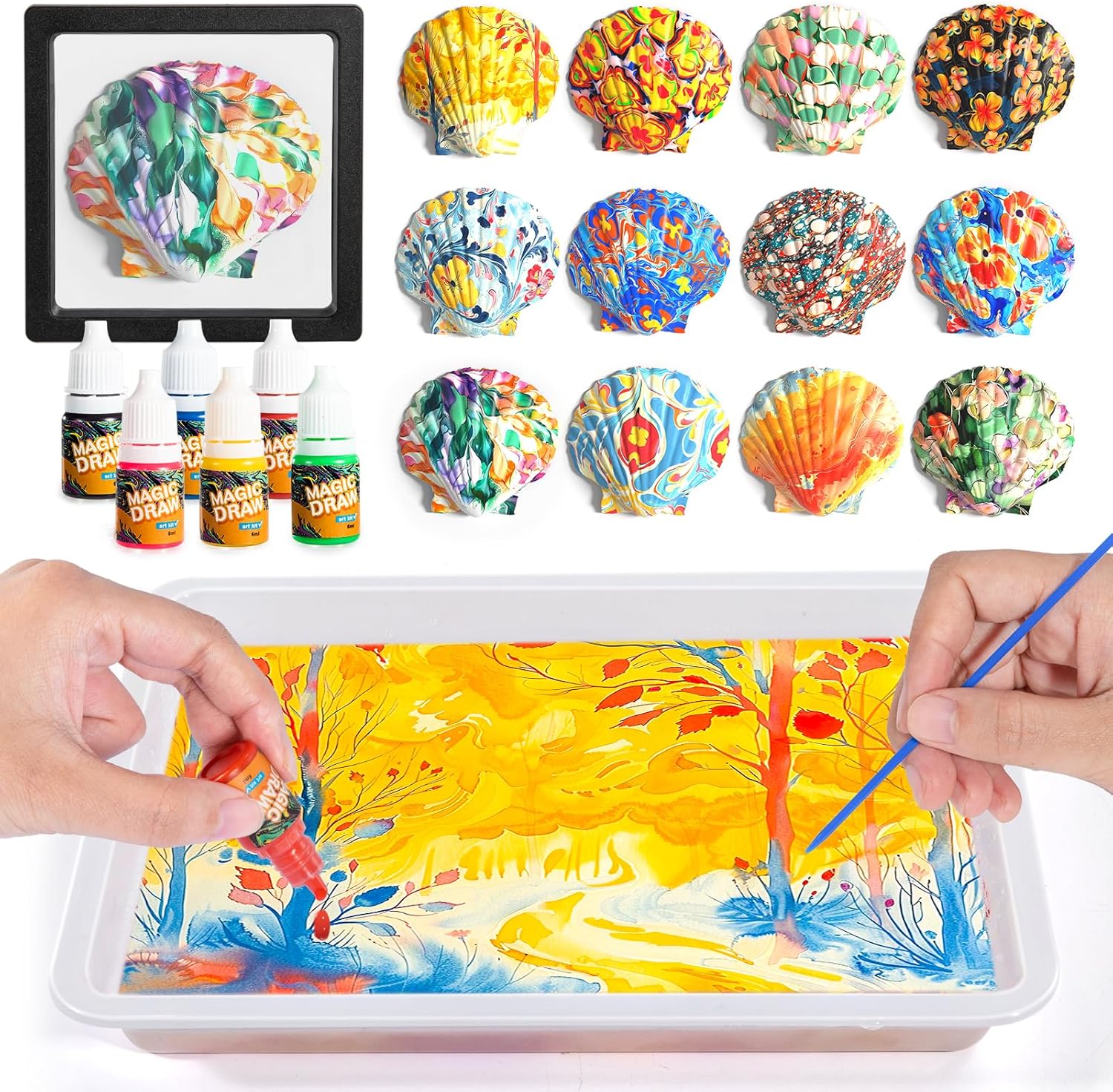 Water Marbling Paint Kit for Kids, Arts & Crafts, Non-Toxic, Age 3-12, Includes 6 Colors, 10 Sheets, Tools, 12 Shells, 2 Display Boxes