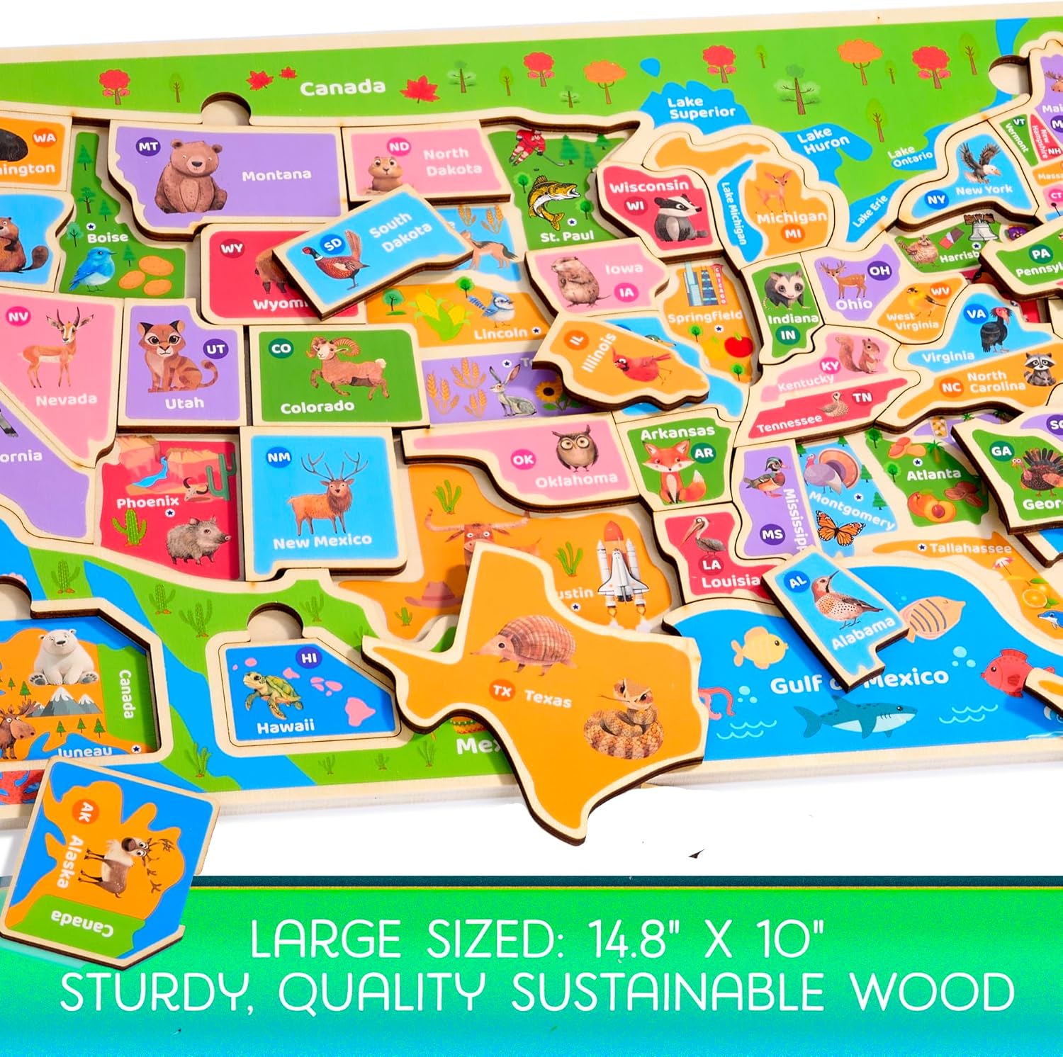 - Detailed Pieces: Features all 50 states, state capitols, and major geographical landmarks, state animals and much, much more!