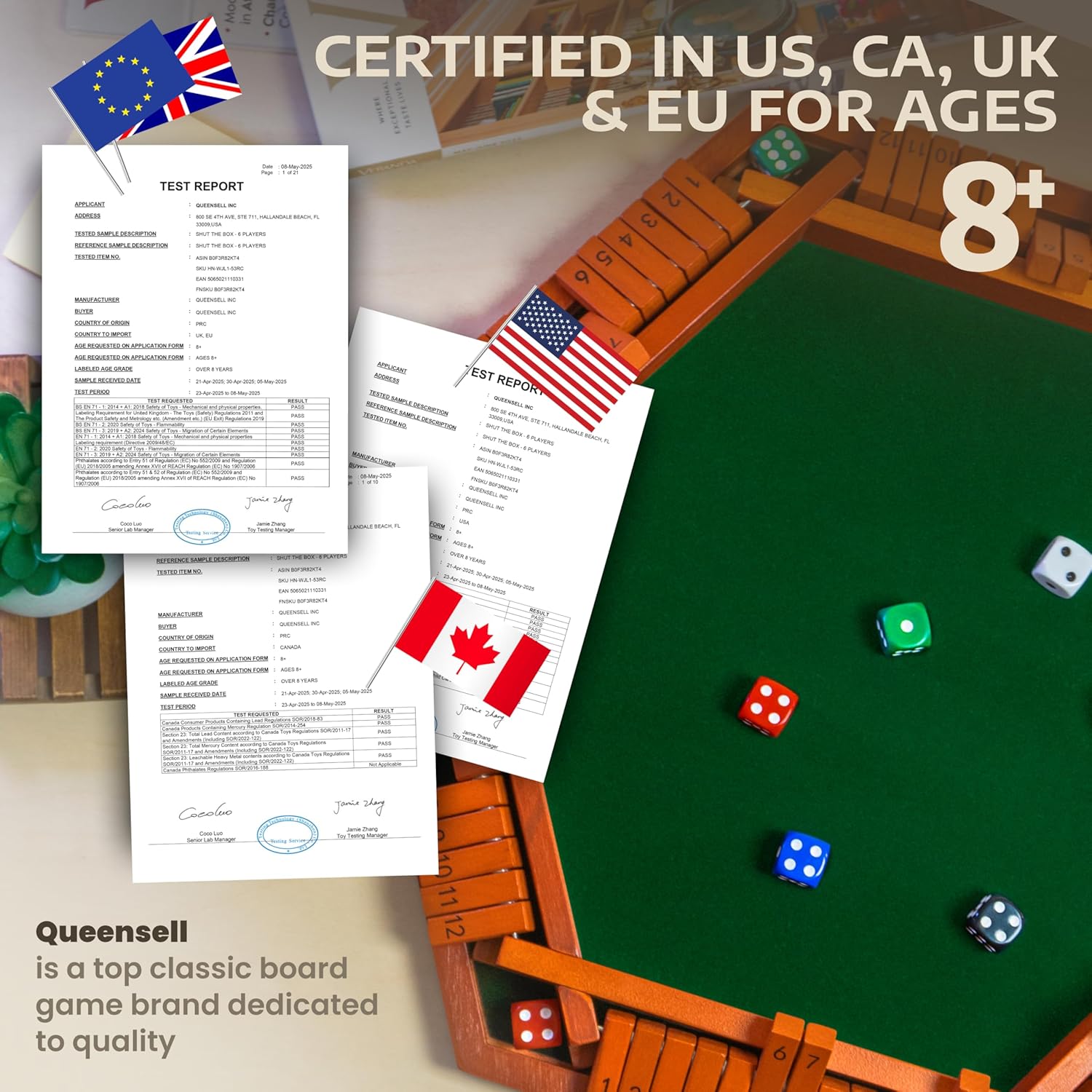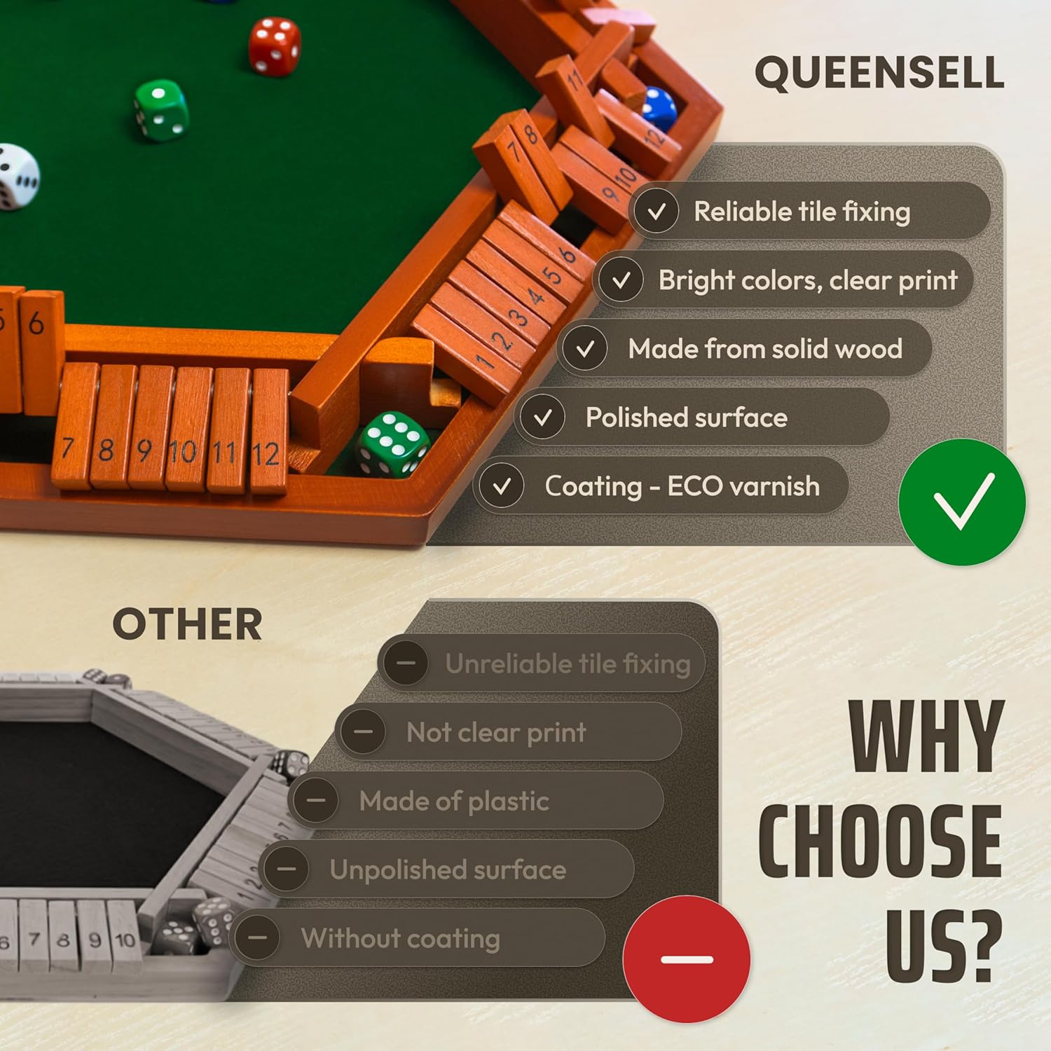 Queensell Shut The Box Game Wooden Board for 1-6 Players - 16-inch Shut The Box Game 12 Numbers for Adults & Kids - Ideal for Games Night