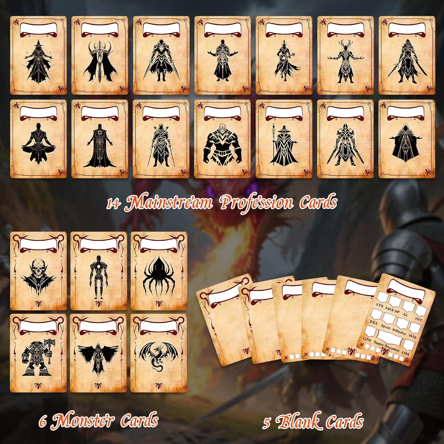 - 1. Waterproof & Reusable Design: Eco-Friendly & Cost-Saving. Includes 14 Profession Cards, 6 Monster Cards & 5 Blank Cards, all made of waterproof material for repeated use. Eliminates disposable paper waste, saving long-term costs for persistent tabletop RPG sessions
