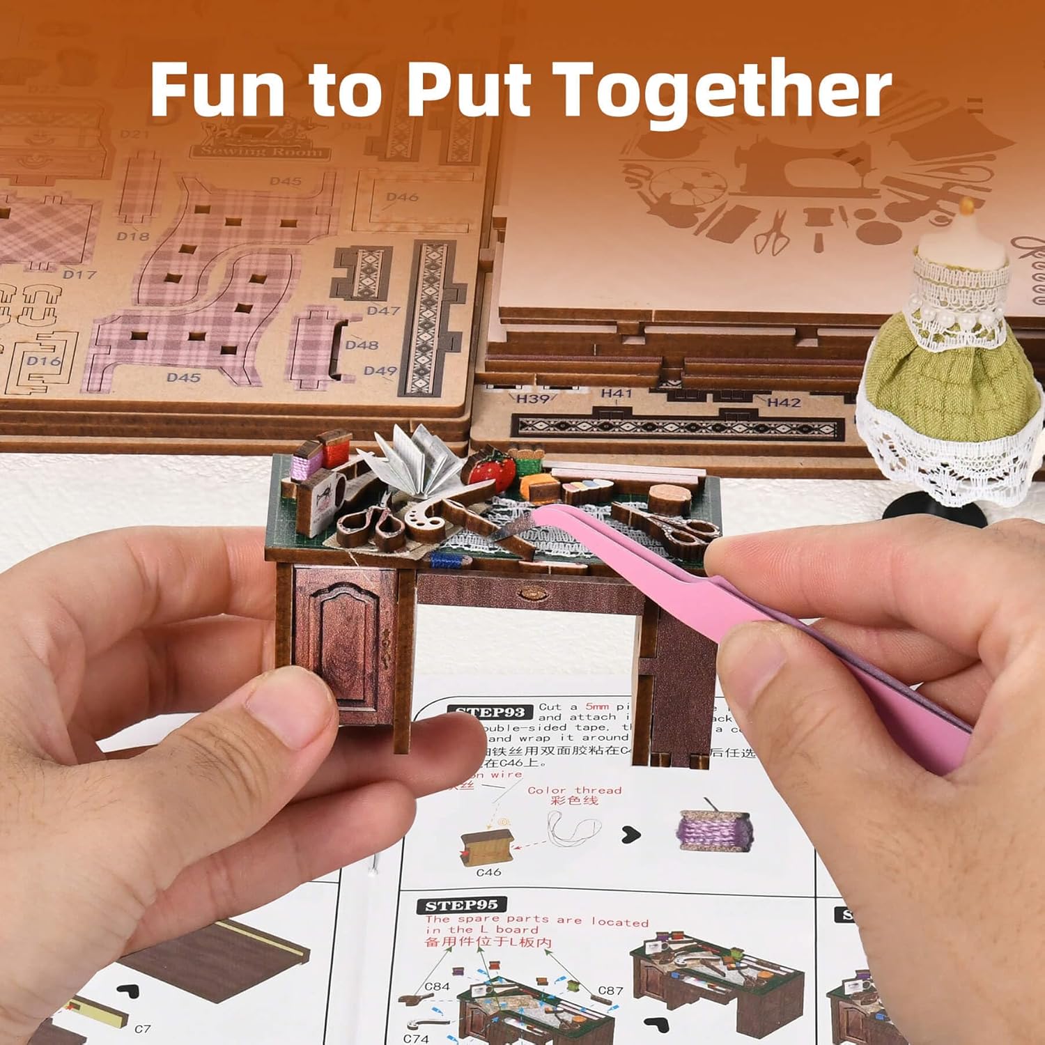 - 【Rich Material Kit to Inspire Creative Customization】 This sewing room book nook kit comes with a wide variety of materials, including fabric, tulle, lace, ribbon, pearls, PVC sheets, and colorful printed stickers, making it different from other ordinary book nook kits. You can fully unleash your creativity by using the included fabrics or your own to design dresses and clothing, and even incorporate your own ideas to create truly personalized and one-of-a-kind miniature pieces.