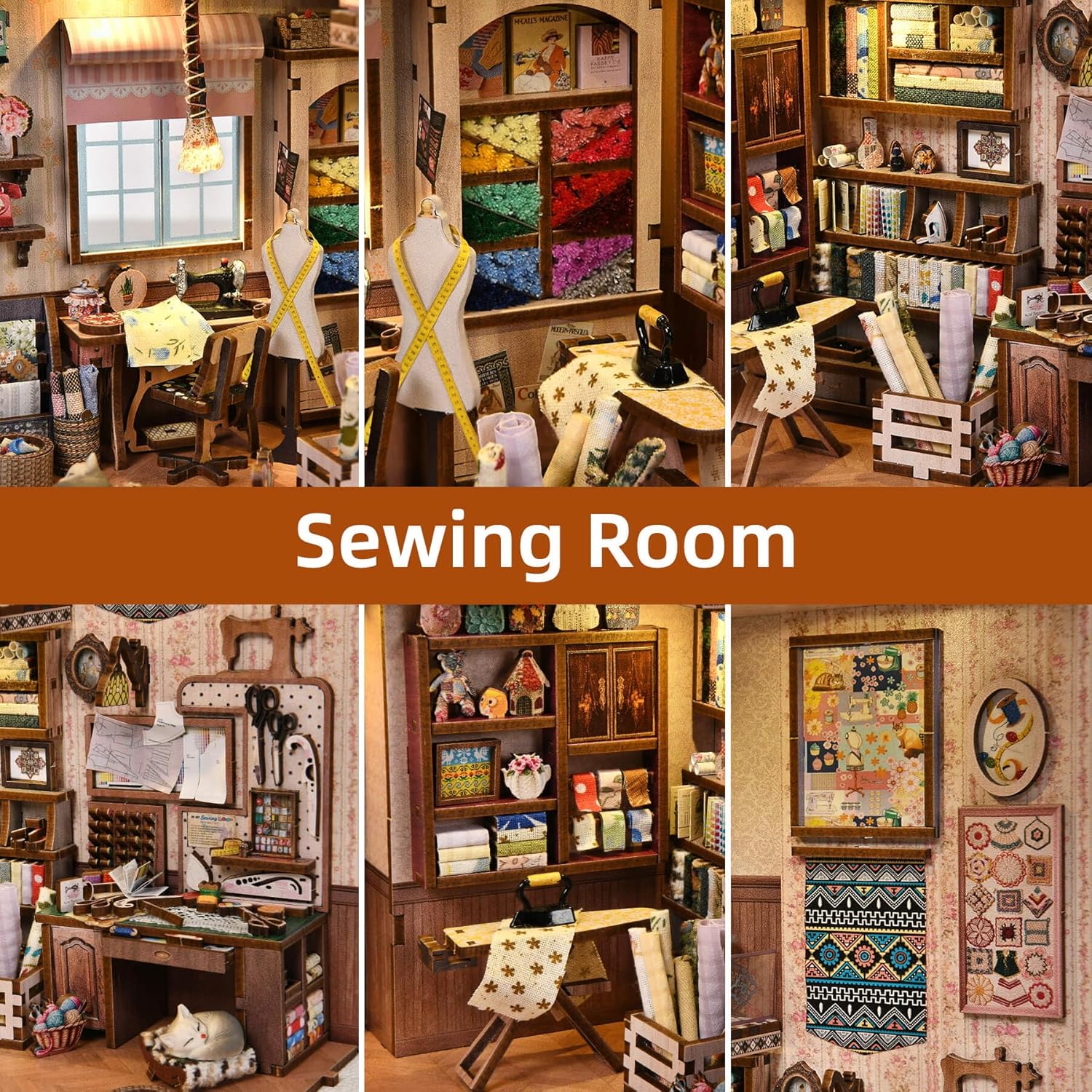 - 【Sewing Room Design】This DIY book nook is inspired by the sewing rooms commonly found in vintage Western homes of the 20th century and in the creative spaces of sewing enthusiasts. It comes with a sewing machine workstation, fabric storage cabinet, ironing station, thread organizer, and fabric roll shelf. Every detail reflects the charm of a classic, creative handmade workspace, making it perfect for display, collection, or as a unique piece of home decor.