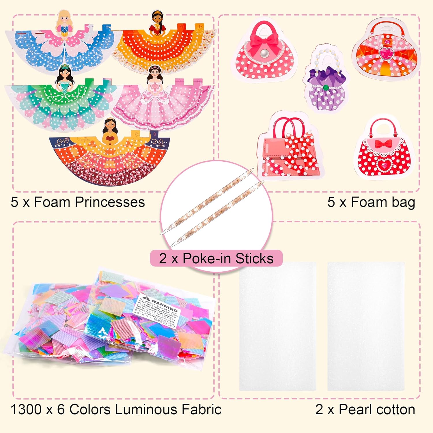 - π¨ Everything Included, Zero Mess: Forget cleanup stress! This all-in-one craft kit has it all: 5 princess forms, 5 purses, 1300+ shiny fabric squares, 2 poke-in cotton pads, and 2 poke-in sticks. The perfect no-mess activity for home or travel.