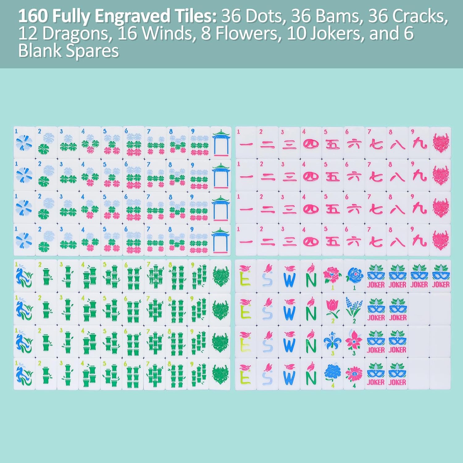 - Complete 160 American Mahjong Set: Includes 36 Dots, 36 Bams, 36 Craks, 12 Dragons, 16 Winds, 8 Flowers, 10 Jokers, and 6 Blank Spares. Fully compatible with American Mahjong rules and gameplay.